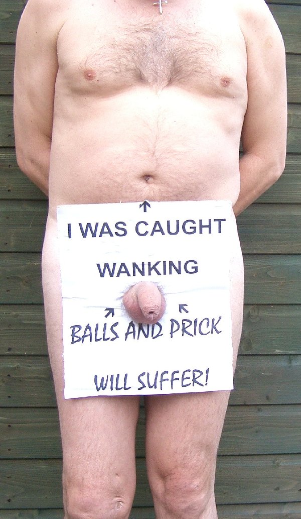 Carver came forward with a notice on stiff board (it looked light so it could have been balsa wood). It had a hole in the middle and on the front was written “I was caught wanking. Balls and prick will suffer.” Arrows pointed to the hole.
