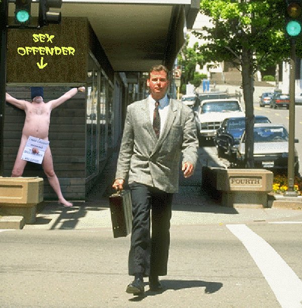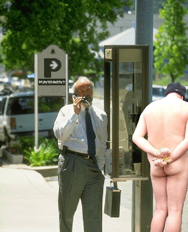 “Because,” said the Sergeant, “You will walk out of this station, to Benson’s and that is where you will be on display. Do not wander from the obvious route as we will be watching on CCTV. This little device is called a Stinger,” he produced a printed circuit the size of a postage stamp, “will be attached behind the board at the base of your dick. Fail to follow our instructions and you will feel a stabbing pain that will last for two seconds the first time; five the second, ten the third; and then will become constant if you disobey four times.” He quickly taped the electronic device behind the board.