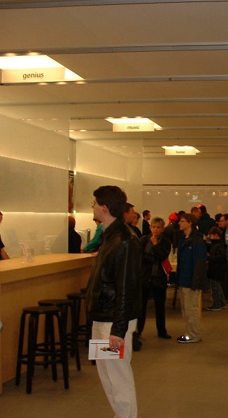 I got an e-mail from a guy I know at the Apple Store in Old Orchard Center (Skokie, IL) earlier this week telling me that someone who'd been at the store's grand opening took a series of photographs, and I wound up in one of them (I had likewise attended the grand opening, just to be there, and get the free t-shirt). I didn't know, until I saw it, that it was just me, in profile, facing the Genius bar.