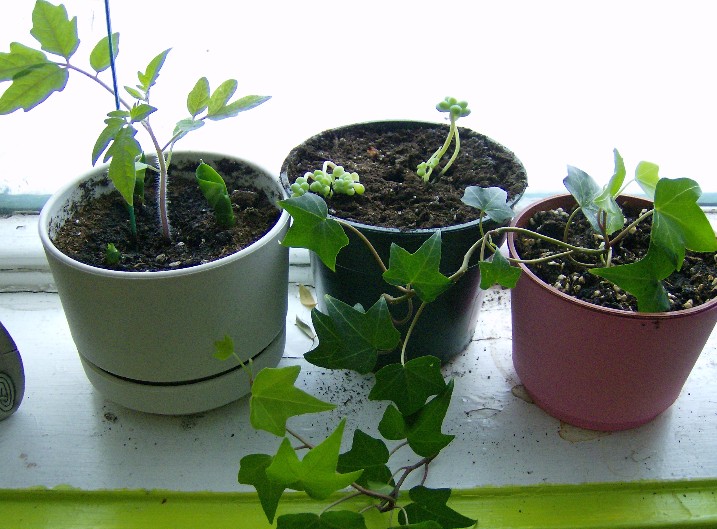 (To the left is my tomato plant!!! It grew from a seed that had already germed inside a tomato I ate around Christmastime...)