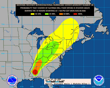 I’m trying to confirm radio reports that “the New Orleans levy system has collapsed".  If there can be a blessing with such an event, Katrina has slowed down to level 3 with ONLY 120 mph winds.
