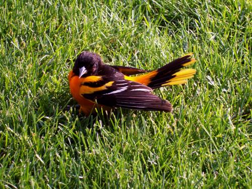 That discovery was early Sunday morning. Later that day, as we worked in the yard, I heard something hit something over by my truck. Turned around to see the antenna on my truck bobbing. Mr. Lixy asked me what happened and I assumed a bird hit it. He went to look and sure enough there was a Baltimore Oriole in the grass. What a beautiful bird! It was stunned but didn't seem badly hurt. It flew away about 20 minutes later. Whew!