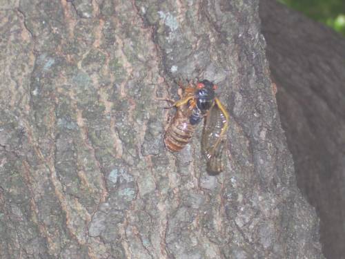 CICADA that is! Peculiar and very noisy critter. This is their year...2004! Dunno what they are? Read a bit about them below. I've included a few pics of their deluge at my house as well.