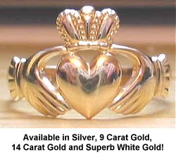 The Claddagh Ring originated in the Claddagh fishing village near Galway City in the West of Ireland. The ring shows two hands (representing friendship) presenting a heart (representing love) adorned by a crown (representing loyalty) and it is thus the traditional Irish wedding band.