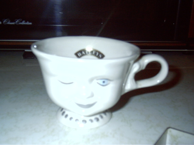 Geezzzzzzzzz......I have so much more to put down here but I am rambling! I really want to post pics of all this stuff and prolly will soon but the reason I started this reply is to tell Lilith of the "almost" collection I was gonna start! I wanted to collect teacups of faces. Three dimensional faces at that! Bailey's (the Irish Creme people) had a novel idea one Christmas and as a bonus at purchase you recieved a teacup designed by a celebrity. I wanted to get the series. I got the first in the series....a cup designed and signed by Helen Hunt. The next year when I wanted the second in the series I was told they discontinued the idea...........aaarrrrrgggggggggg! Included is a pic of my one and only three dimensional teacup. She looks so lonely!