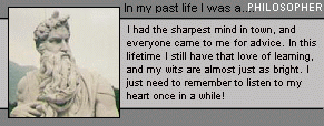 I was a philosopher - I had the sharpest mind in town, and everyone came to me for advice. In this lifetime I still have that love of learning and my wits are almost just as bright. I just need to remember to listen to my heart once in a while!