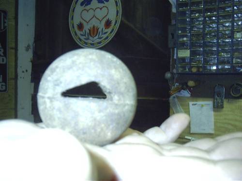 I tried my best to get as much detail of that thing as I could PF! Yes..the hole goes all the way through.....yes it does have a cast line. I likened it to the same way they make dipsey's (weights) for fishing........one side of mold filled with molten metal...then the other...and close it and let cool...and voila.....a whole weight! Didn't scratch it yet......haven't tried to clean it either. It's rusty and has a pitted surface though. I used to live near the Red Bank Battle Field in National Park, N.J........and they had an exibit of cannon balls and the house left standing from the battle of Hessian Run still had some balls in the side.....and they looked very similar to this thing....though they didn't have holes and they weren't as small.