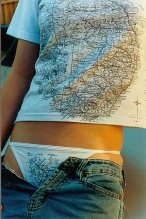 A matching set of tee shirt and sexy female panties is now being marketed with the tee having a map of the australian continent on it and the panties with the tasmanian map located in just the right position