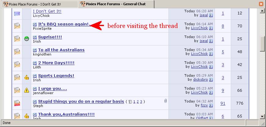 Once you follow the link by clicking on the title, and browse the thread, when you return to the forum thread list, the thread title will be displayed in normal style and the icon will change to a closed envelope, indicating that there is nothing new in the thread.