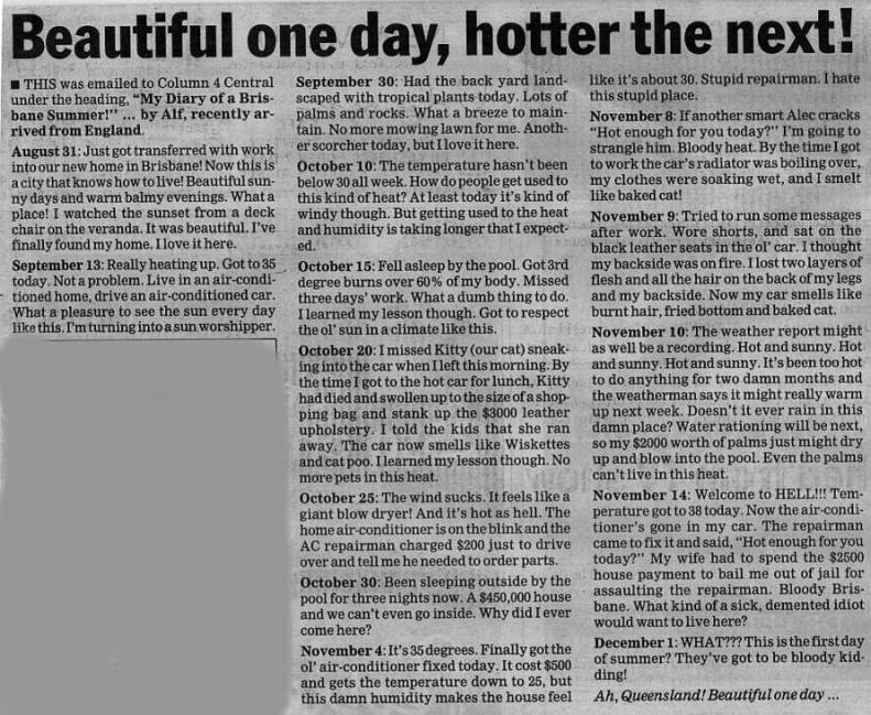 It's bit of a diary writen by Alf....an Englishman fairly new to Australia