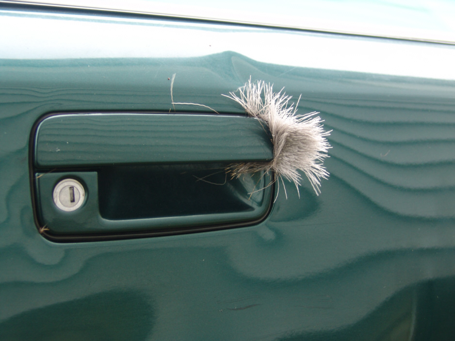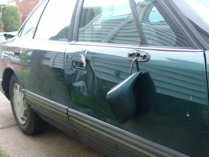 With the cars suddenly stopped, I pulled over and got out to see the damage wasn't really that bad. All the damage was confined to the front passenger door, not a scratch in front of or behind it. Mirror torn off, door dented and calling card stuck under the door handle, ….. and considering I was hit by a deer, it was really very little when knowing what damage CAN be done by such a collision.